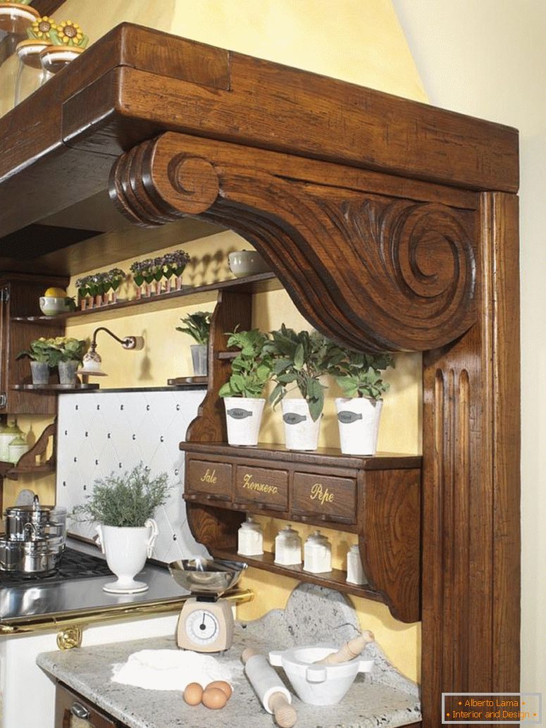 Aby zachować klasyczne cechy, krawężnik pod zlewem i podstawki nad nim zostały stworzone z uroczego ciemnego drzewa.